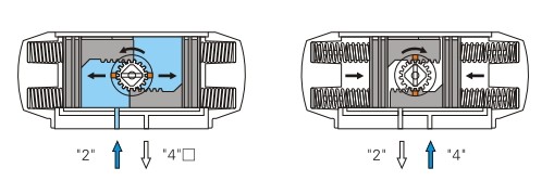 當(dāng)氣源壓力從氣口(2)進(jìn)入氣缸兩活塞之間中腔時(shí),使兩活塞分離向氣缸兩端方向移動(dòng),兩端氣腔的空氣通過(guò)氣口(4)排除, 同時(shí)使兩活塞齒條同步帶動(dòng)輸出軸(齒輪)逆時(shí)針?lè)较蛐D(zhuǎn)。反之氣源壓力從氣口(4)進(jìn)入氣缸兩端氣腔時(shí),使兩活塞向 氣缸中間方向移動(dòng),中間氣腔的空氣通過(guò)氣口(2)排除,同時(shí)使兩活塞齒條同步帶動(dòng)輸出軸(齒輪)順時(shí)針?lè)较蛐D(zhuǎn)。 (如果把活塞相對(duì)反方向安裝,輸出軸變?yōu)榉聪蛐D(zhuǎn),即為雙作用反轉(zhuǎn)型)